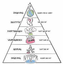Wil je jezelf verder ontwikkelen en (door)groeien in je werk? Dan is het de kunst om deze niveaus van jezelf te (leren) kennen. Als je deze piramide voor jezelf concreet hebt gemaakt, zul je merken dat misschien je eerste oplossingsgedachte van het volgen van een opleiding wellicht helemaal niet nodig is, maar dat er in je werk aanpassingen gedaan kunnen worden (gedrag of context) om het voor jezelf leuk te houden (overtuigingen/waarden). Dit noemen we dan jobcrafting.