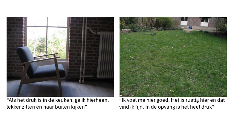 De kinderen geven aan behoefte te hebben aan plekken die zowel open als geborgen zijn: een eigen plek, maar ook dicht bij hun ouders. Ruimte, maar ook duidelijke grenzen. Peters: “Dat lijken tegenstrijdigheden, maar deze kinderen hebben vaak veel meegemaakt. Het is logisch dat zij plekken zoeken waar zij kunnen ontdekken, maar wel binnen duidelijke kaders. Ze zoeken veiligheid, maar óók iets om mee te maken.” Uit de foto’s die de kinderen maakten, blijkt hoe dat eruit kan zien: ze fotograferen natuur, kleur, zachte materialen en gezellige hoekjes.