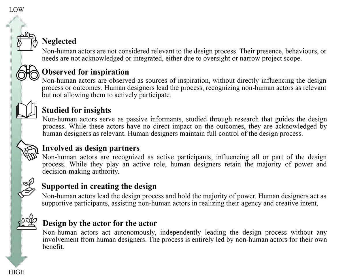 - Spectrum of Non-Human Agency. Een conceptueel kader dat verschillende gradaties van niet-menselijke betrokkenheid in ontwerpprocessen illustreert, variërend van verwaarloosd tot autonome 'agency' (vrij vertaald: zelfbeschikking, agentschap). Dient zowel als analytisch hulpmiddel als een gids voor het ontwikkelen van multispecies-ontwerpstrategieën.