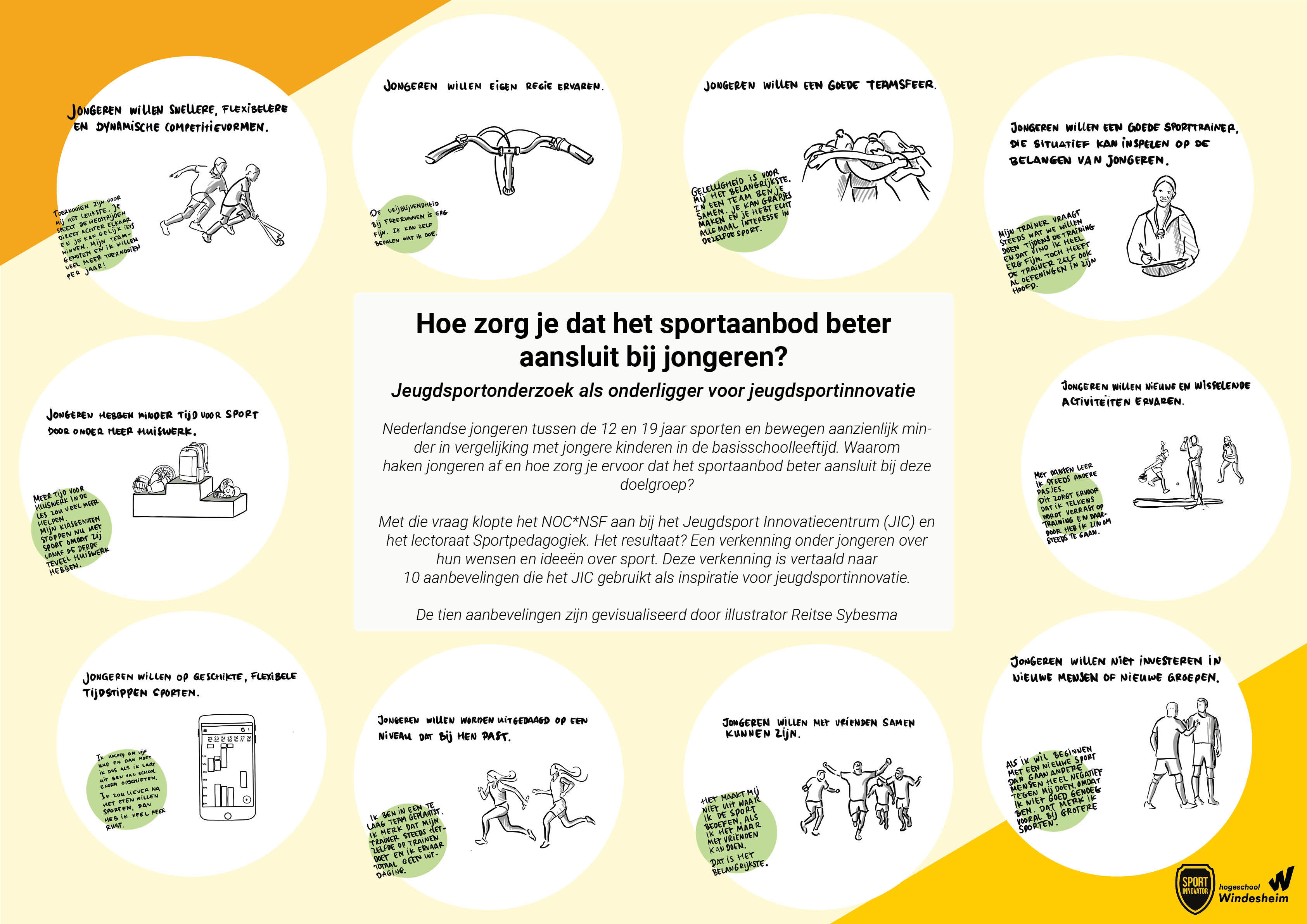 De tien aanbevelingen zijn gevisualiseerd door illustrator Reitse Sybesma voor het Jeugdsport Innovatiecentrum (JIC) omdat deze aanbevelingen een van de belangrijke onderleggers zijn voor jeugdsportinnovatie.